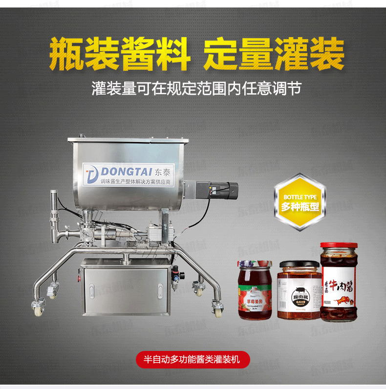辣椒醬灌裝機(jī) 適合于將各類粘稠體及含有各種固體物質(zhì)如辣椒、花生、肉塊、佐料等物體的醬類和油、料分離的火鍋底料等灌裝于各種容器中,辣椒醬灌裝機(jī) 適用于辣椒醬、顆粒醬料、大塊肉醬、火鍋底料等的灌裝。辣椒醬灌裝機(jī) /半自動辣椒醬灌裝機(jī)可灌裝顆粒漿狀流體物料,特別適用于調(diào)味品中帶顆粒并且濃度較大的辣椒醬、火鍋底料等粘稠醬類的灌裝,配置的自動攪拌器,辣椒醬灌裝機(jī) 保證了醬和油的充分混合,又稱為辣椒醬灌裝機(jī)、花生醬灌裝機(jī)、豆瓣醬灌裝機(jī)、果醬灌裝機(jī),芝麻醬灌裝機(jī)、粘稠醬類灌裝機(jī)、牛肉醬灌裝機(jī)。
