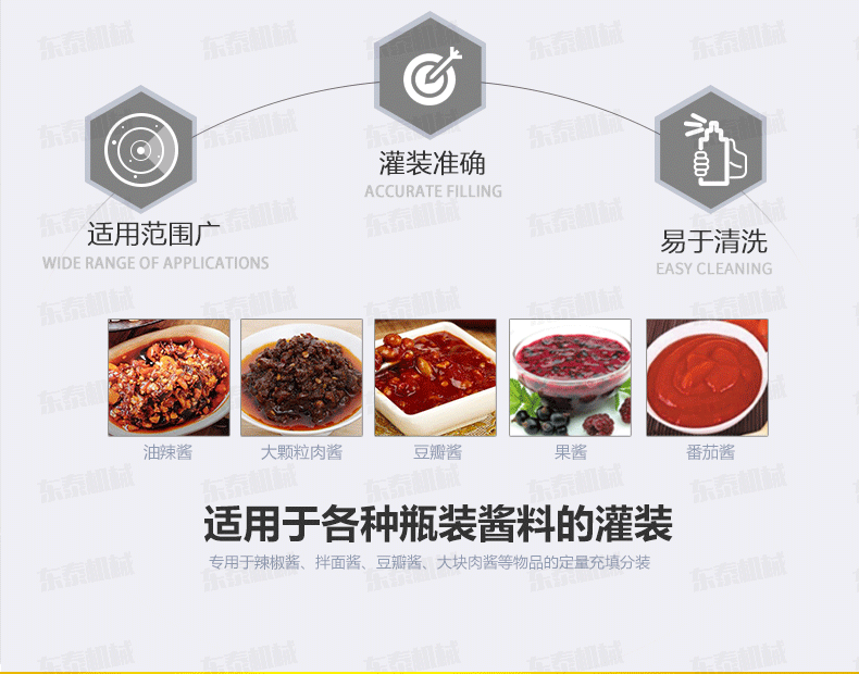 4、顆粒醬定量灌裝機(jī)主要針對食品行業(yè)的醬類分裝設(shè)計生產(chǎn),香菇醬灌裝機(jī)特別適用于調(diào)味品中帶顆粒并且濃度較大的辣椒醬、豆瓣醬、花生醬、芝麻醬、果醬、牛油火鍋底料、紅油火鍋底料等物質(zhì)的粘稠醬類的灌裝;