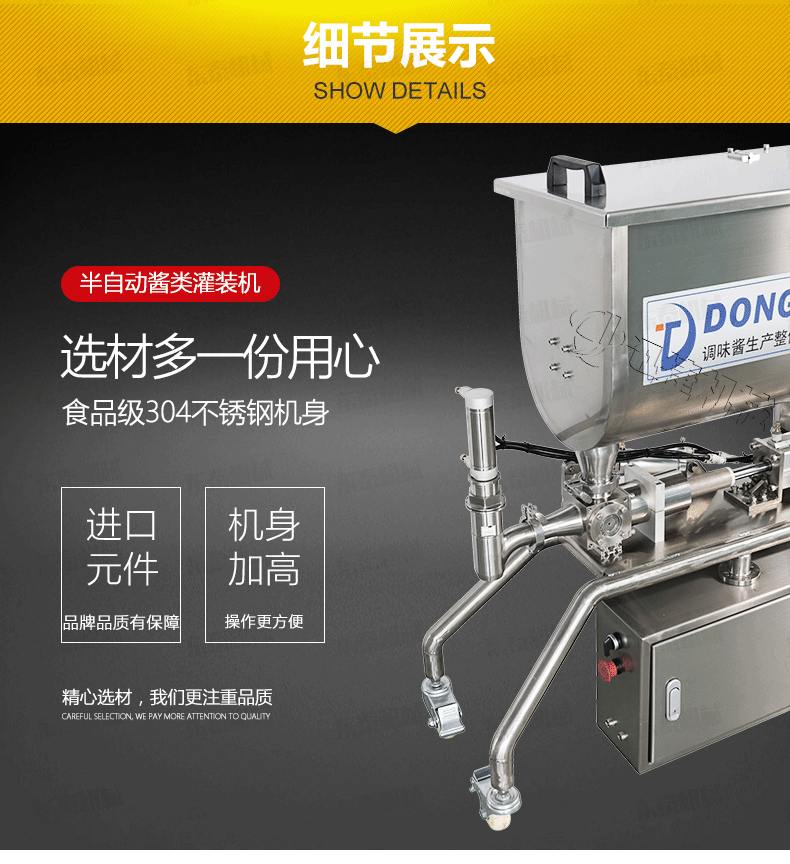 2、 醬料灌裝機(jī)設(shè)備全不銹鋼制作,衛(wèi)生、安全;