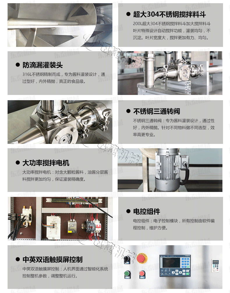 3、醬料灌裝機(jī)采用的臥式攪拌結(jié)構(gòu),醬和油可以得到充分混合,極大的提高計量的精度和灌裝性能;