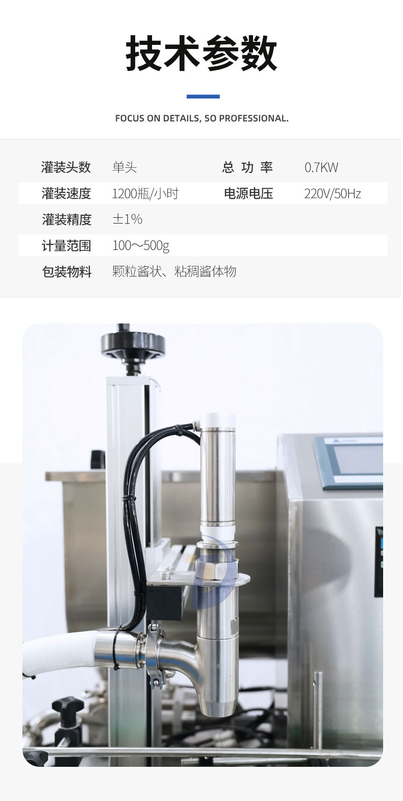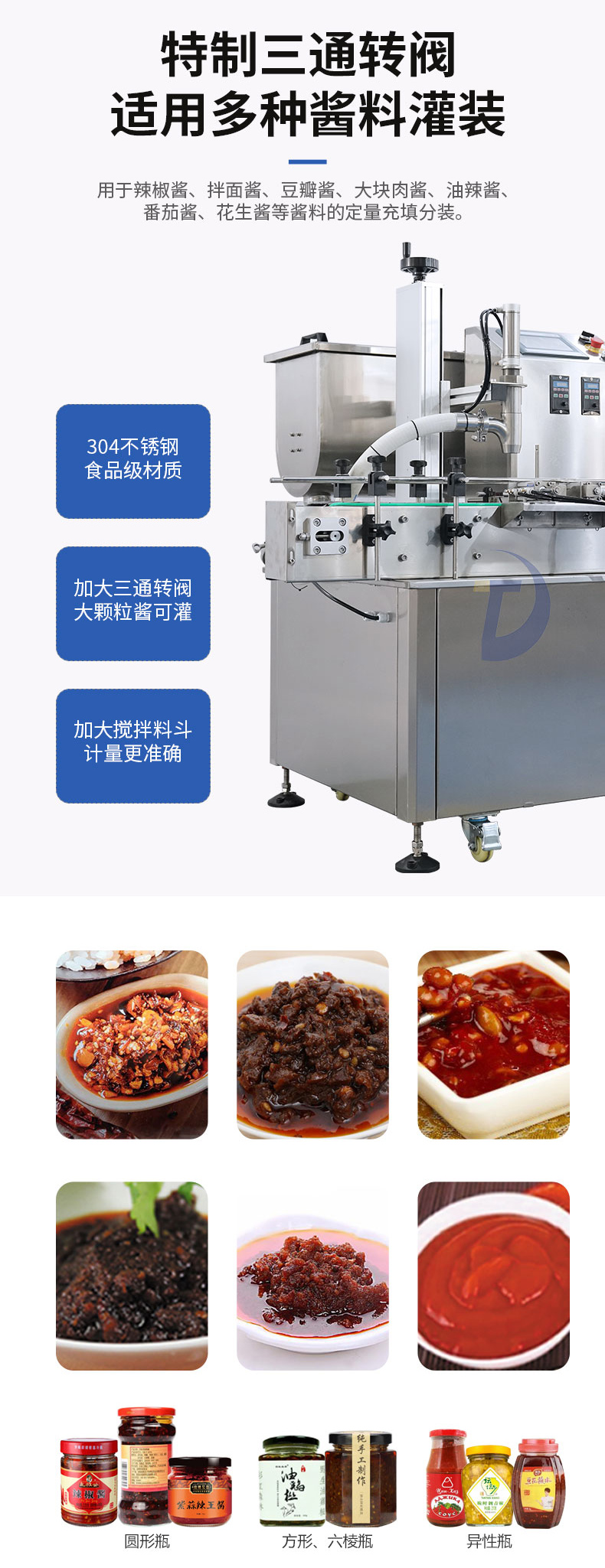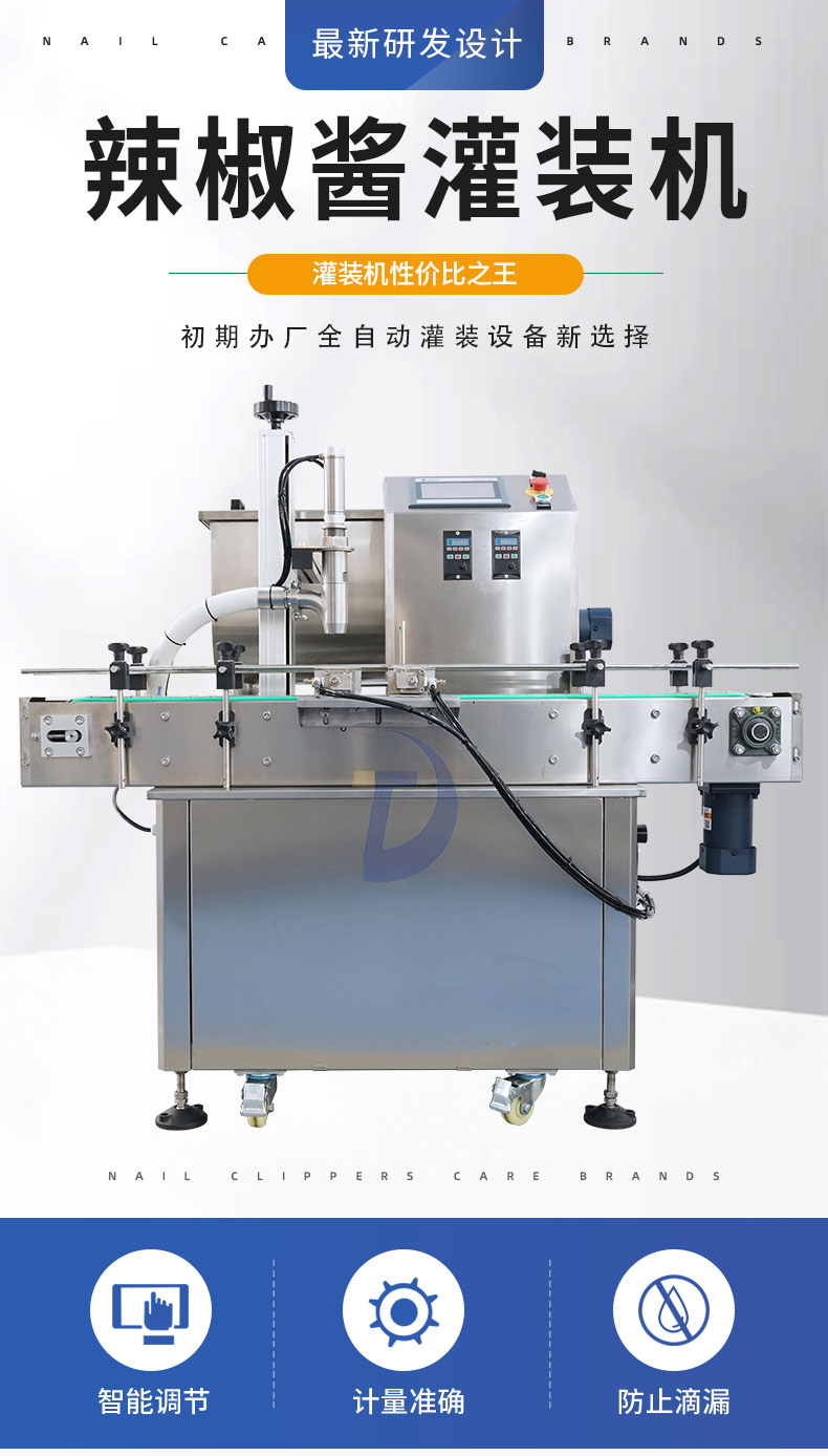 用于辣椒醬、拌面醬、豆排醬、大塊肉醬、油辣醬、 番茄醬、花生醬等醬料的定量充填分裝。