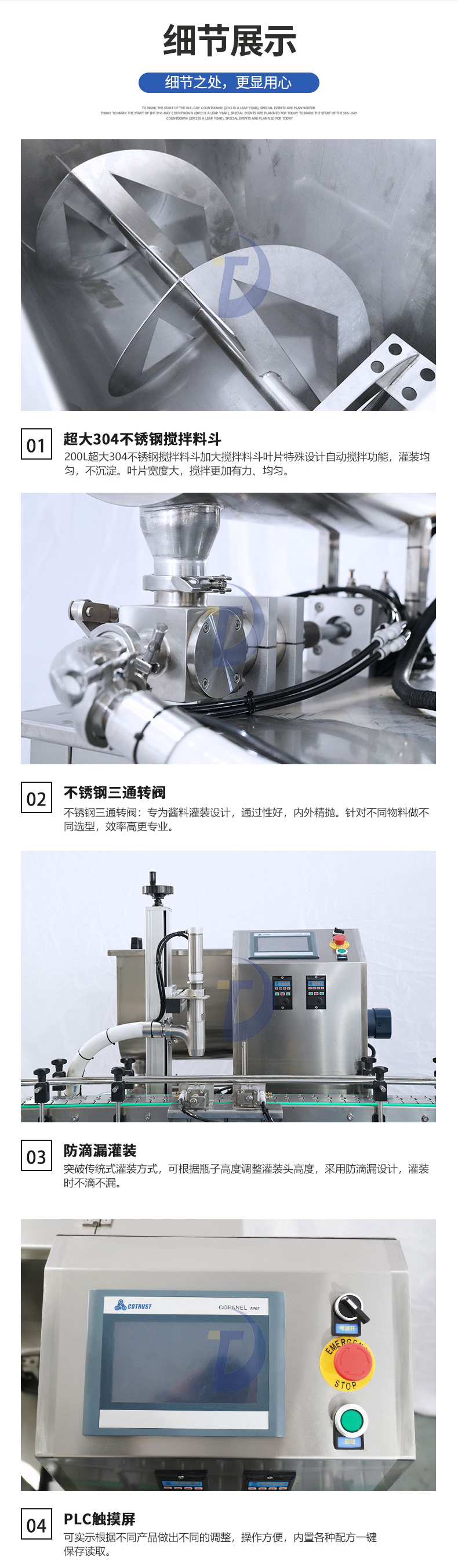 - 用于辣椒醬、拌面醬、豆排醬、大塊肉醬、油辣醬、 番茄醬、花生醬等醬料的定量充填分裝。 304不銹鋼食品級材質(zhì) 加大三通轉(zhuǎn)閥大顆粒醬可灌 加大攪拌料斗計量更準確...