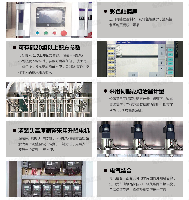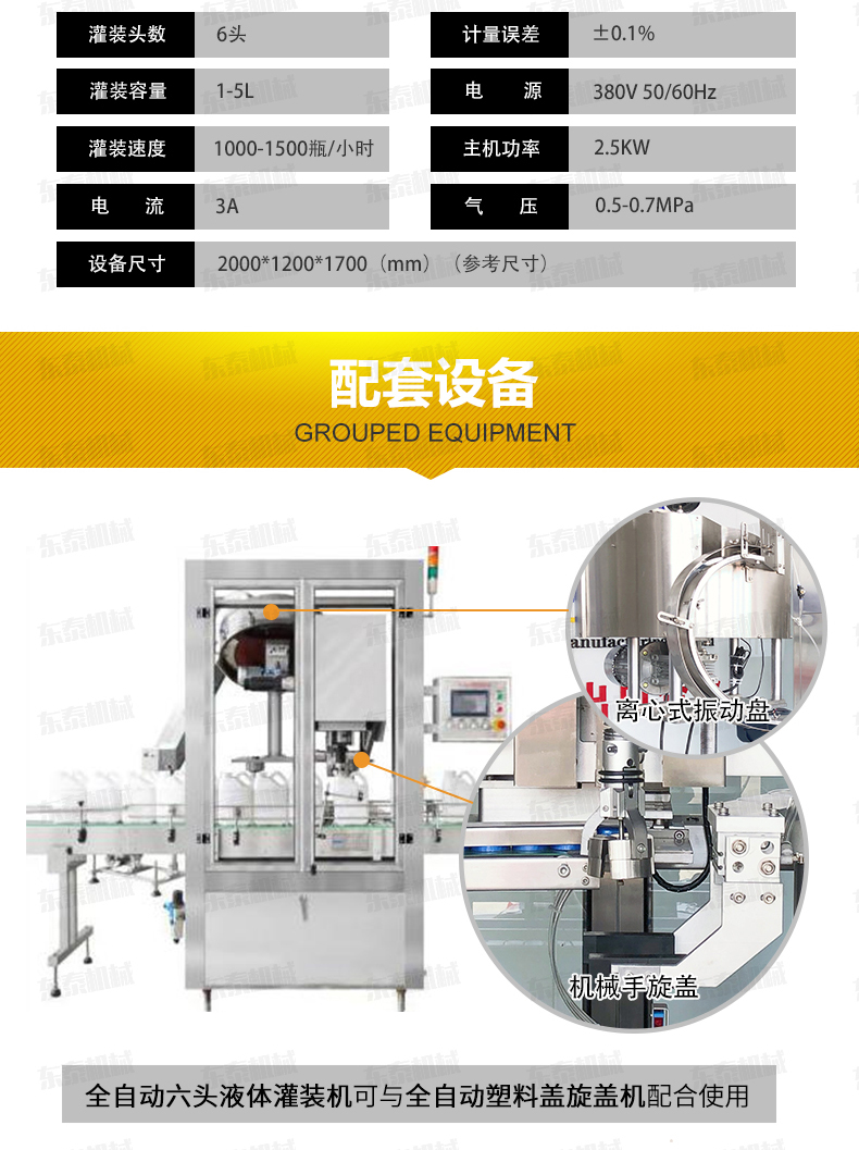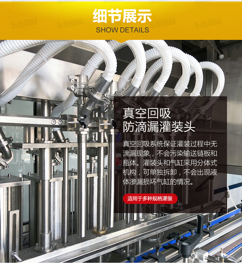5、具有無瓶不灌裝、自動進瓶出瓶、自動定位灌裝、自動控制液位等功能,自動化程度高;灌裝嘴設(shè)計科學(xué)合理,配防滴漏裝置,灌裝不滴漏,擁有物料瓶及設(shè)備的干凈衛(wèi)生。
