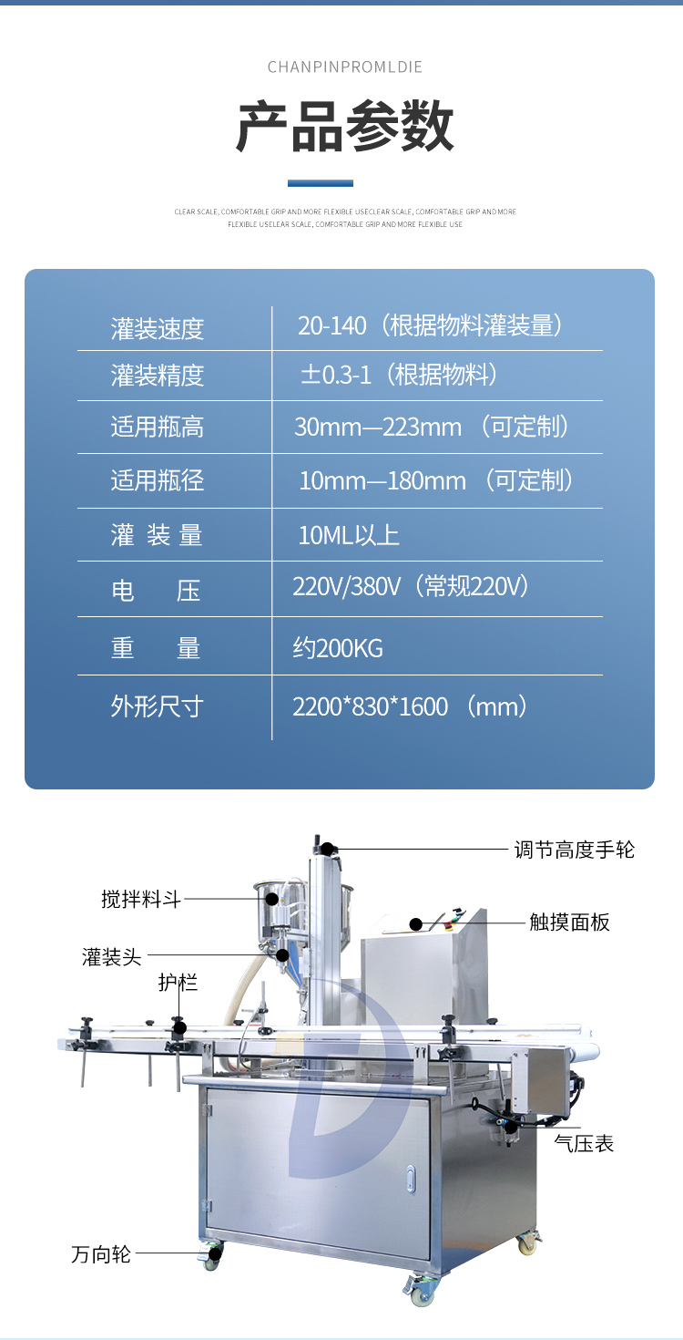 設(shè)備突破傳統(tǒng)式灌裝方式,可根據(jù)瓶子高度調(diào)整灌