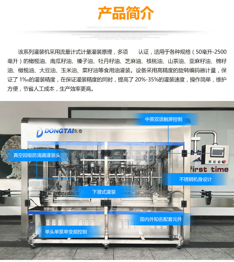 該食用油灌裝機采用流量計式計量灌裝原理,多項認證,適用于各種規(guī)格(1-5升)的南瓜籽油、榛子油、牡丹籽油、芝麻油、核桃油、山茶油、亞麻籽油、棉籽油、橄欖油、大豆油、玉米油、菜籽油等食用油灌裝。設備采用高精的旋轉編碼器計量,保證了1%o的灌裝精度,在保證灌裝精度的同時,提高了20%-35%的灌裝速度,操作簡單,維護方便,節(jié)省人工成本,生產(chǎn)效率更高。
